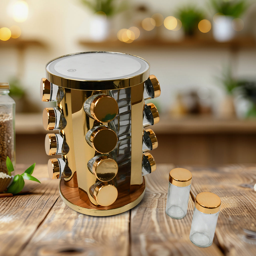LED Spice Rack Organizer | 360° Rotating Tower with 16 Seasoning Jars | Stainless Steel Kitchen Storage Rack (Golden / 16 Pc / MOQ: 6 pc)